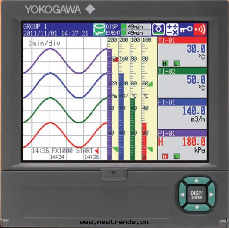 FX1010無紙(zhǐ)記(jì)录(lù)仪将測量(liàng)數據(jù)實(shí)时(shí)显示在(zài)彩色(sè)色(sè)液晶画(huà)面(miàn)上(shàng)並(bìng)能(néng)将數據(jù)保存在(zài)CF 卡(kǎ)上(shàng)的(de)記(jì)录(lù)仪。可(kě)在(zài)各(gè)个通(tòng)道(dào)任意(yì)設定(dìng)直(zhí)流電(diàn)壓輸入(rù),热(rè)電(diàn)阻輸入(rù),热(rè)電(diàn)偶輸入(rù)及(jí)開(kāi)關(guān)量(liàng)輸入(rù)等。FX1000 有(yǒu)2,4,6,8,10,12通(tòng)道(dào)型共(gòng)6 种機(jī)型。通(tòng)过(guò)标(biāo)準软(ruǎn)件,对(duì)CF 卡(kǎ)中(zhōng)的(de)數據(jù)進(jìn)行波(bō)形,數字(zì)等显示,也(yě)可(kě)以(yǐ)打(dǎ)印(yìn)輸出。还可(kě)轉(zhuǎn)換成Lotus1-2-3,Excel 或者(zhě)ASCII 格式。也(yě)可(kě)選配 Modbus/TCP和(hé)DAQLOGGER软(ruǎn)件與(yǔ)電(diàn)腦實(shí)时(shí)通(tòng)訊。